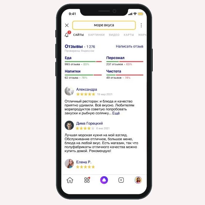 начал анализировать отзывы пользователей, обобщать их и показывать в результатах поиска визуальную шкалу оценок. Так, если задать запрос о каком-либо ресторане, поиск покажет, как другие посетители оценили кухню или персонал.